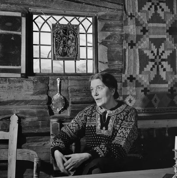 Bjørnsgard, tømmerhus, interiør, stue, kvinne, skuespiller, bondeantikviteter