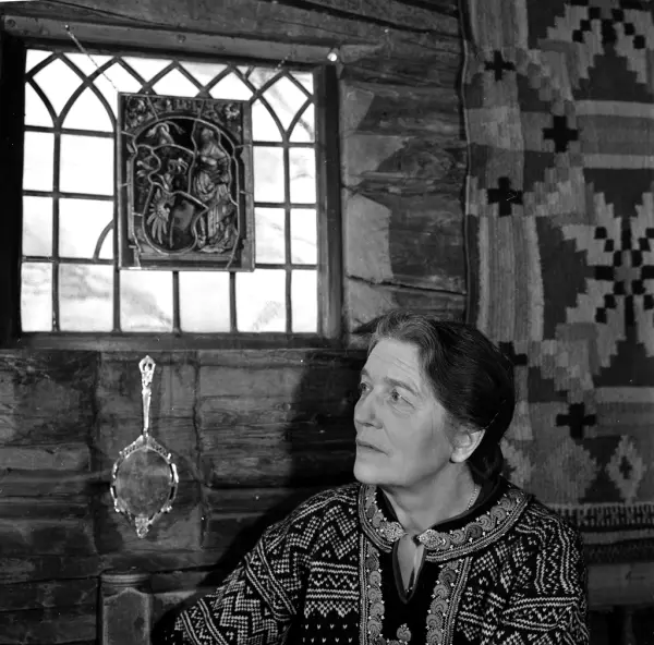 Bjørnsgard, tømmerhus, interiør, stue, kvinne, skuespiller, bondeantikviteter