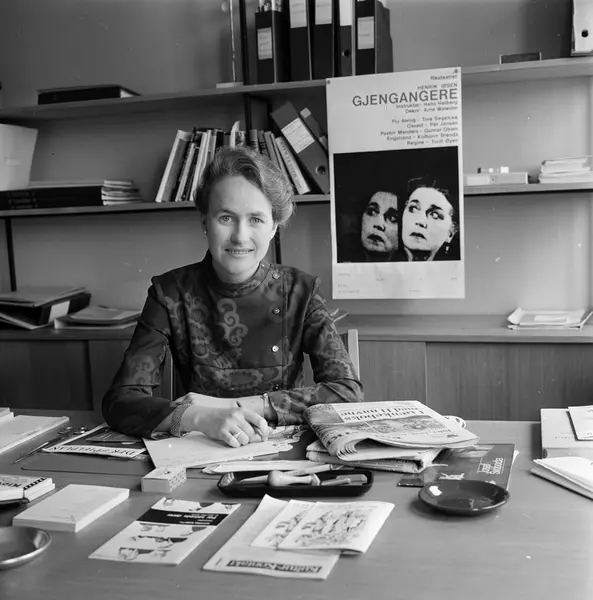 Riksteatret, interiør, kontor, kvinne, sittende halvfigur ved skrivebord, teaterplakat: Gjengangere