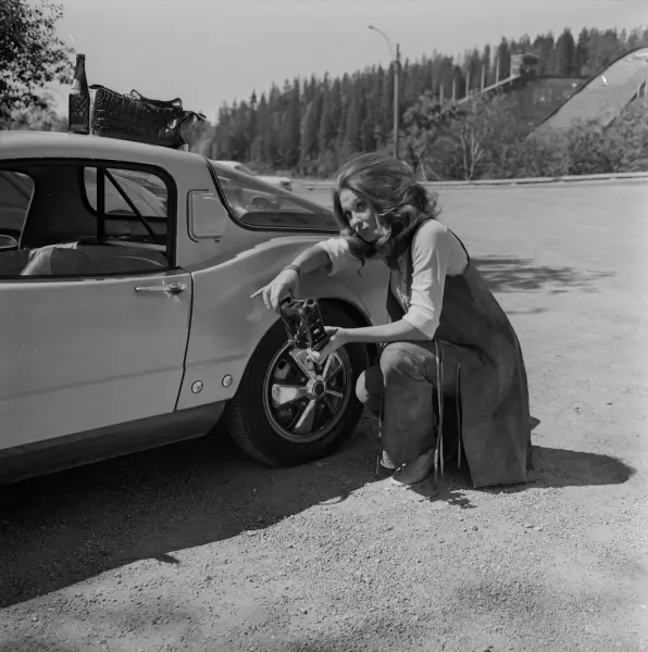 Damenes Trafikkløp ble arrangert av Motorførernes Avholdsforbund og bladet Alle Kvinner. Åse Klevelands bil er en Saab Sonett V4. Rigmor Dahl Delphin (1908-1993) var ansatt som fotograf i ukebladet Alle Kvinner. Hennes negativarkiv ble i 2005 overført Oslo Bymuseum fra Gyldendal Norsk Forlag som var utgiver av bladet.