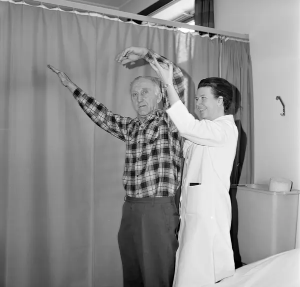 Ullevål sykehus, Fysikalsk-medisinsk avdeling, mann, pasient, kvinne, fysioterapeut, gymnastikk