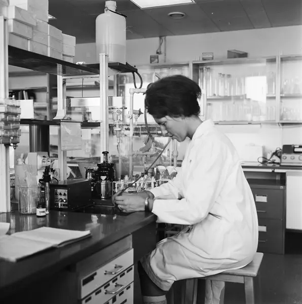 Ullevål sykehus, interiør, sentrallaboratoriet, kvinne
