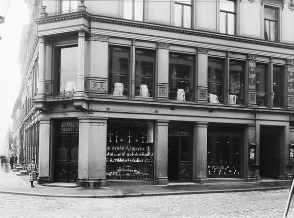 forretningsgård, David Andersen gullsmedforretning, Christian Rohde kåpelager, Jac. Jacobsen urmaker, utstillingsvinduer