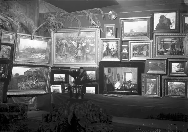 Kunst-Udstilling i Kristiania 1882 (Den første Høstutstillingen) i Det Norske Studentersamfund, 1882, interiør, utstillingslokale, kunstutstilling, malerier