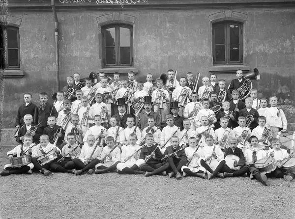 Møllergata skoles musikkorps, gutter, musikkinstrumenter, menn, sittende og stående helfigur