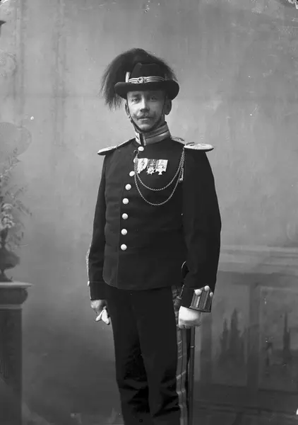 Uniform som kaptein og sjef for H.M. Kongens garde. På hatten er løven som erstattet kongemonogrammet fra 24.07.1905 til Kong Haakon VIIs monogram ble innført.