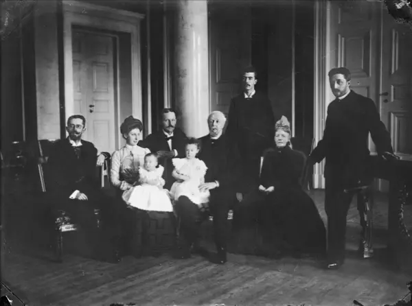 Kongefamilien i Lille festsal på Slottet, julen 1901. Fra venstre: Gustav V, prinsesse Ingeborg med prinsesse Märtha, prins Carl, kong Oscar II med prinsesse Margaretha, prins Gustav VI Adolf, dronning Sophie og prins Eugen.