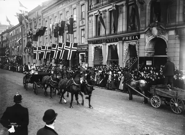 statsbesøk, britiske kongepar, opptog, hestekjøretøyer, publikum, flagg, forretningsgårder