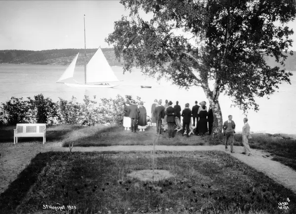 hage, hagemøbler, mennesker, St. Hansfeiring, utsikt, fjord, seilbåt