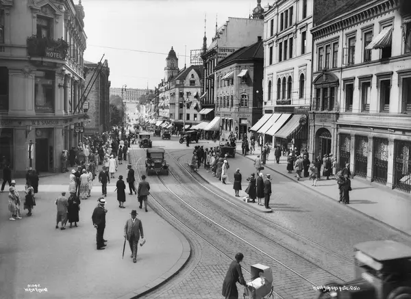 gateløp, forretningsgårder, Stortingsbygningen, Slottet, biler, trikker, mennesker, gateliv