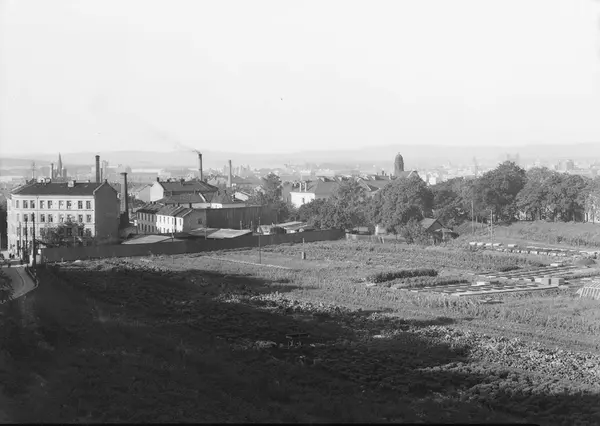 utsikt, løkke, åker, gartneri, bygårder, fabrikkpiper, Tøyen skole, Schous Bryggeri