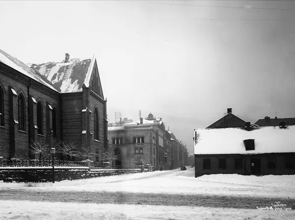 gateløp, bygårder, Johanneskirken, snø, gatebelysning