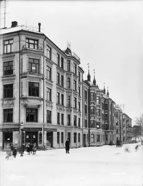 gateløp, bygårder, kolonialforretning, barn, kjelker, hestekjøretøy, snø