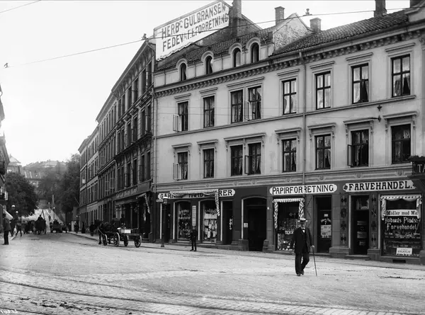 gate, bygård, papirforretning, fargehandel, utstillingsvinduer, gavlreklame, hest, kjerre, mennesker