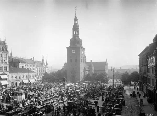 torg, torghandel, boder, blomster, mennesker, portrettstatue, pissoir, trikker, Vår Frelsers kirke, forretningsgårder