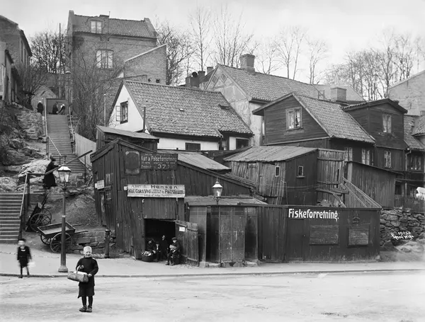 trapp, trehusbebyggelse, fiskeforretning, brenselsforretning, pissoir, bolighus, gatebelysning, gutter