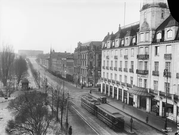 gateløp, Grand Hotel, Hotell Nobel, forretningsgårder, park, kiosk, trikk, bil, mennesker, gateliv