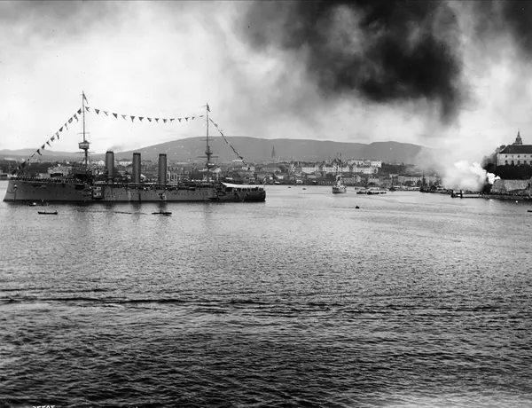 dampskip Kristianiafjord, småbåter, britisk panserkrysser HMS Cornwall, Akershus festning, salutt, Slottet