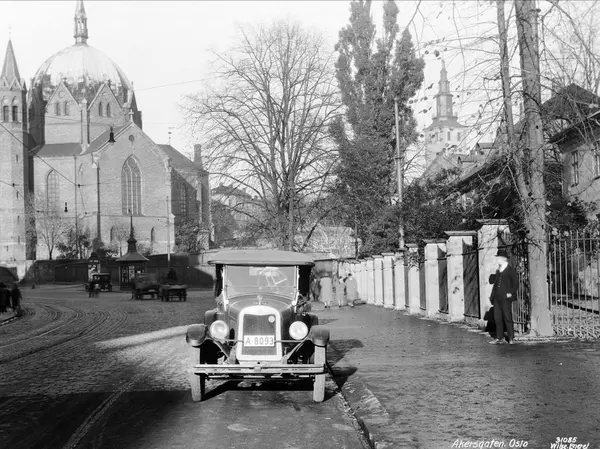 Bilen er en Chevrolet personbil, 1926-modell, tilhørende Eugen Andresen, Mogata 20 ifølge Bilboken for Norge 1927.