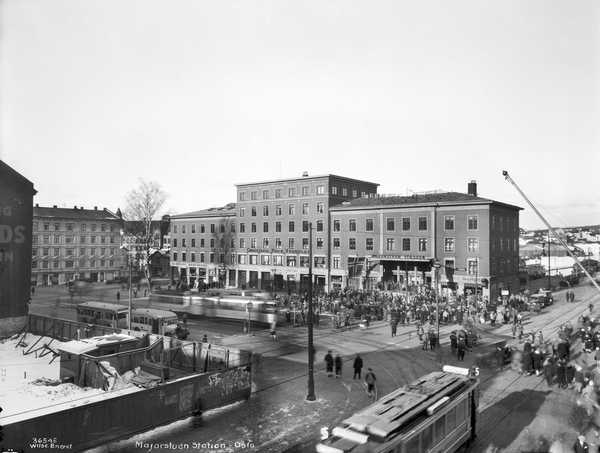 gatekryss, forretningsgårder, Majorstuen stasjon, trikker, busser, mennesker