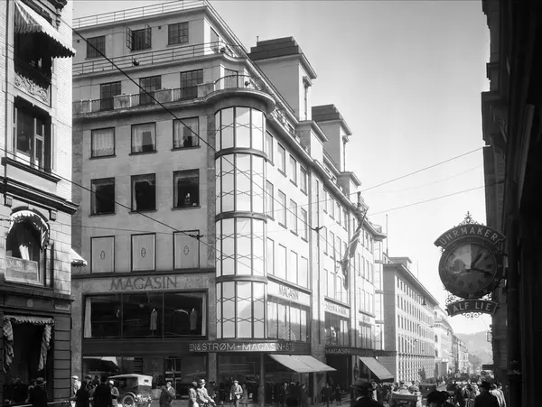 gateløp, forretningsgård, Steen & Strøm stormagasin, mennesker, biler, trikk, gateliv, urmaker-skilt