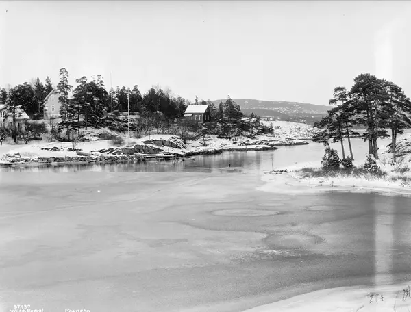 Bildet er tatt fra Halden brygge mot Rolfstangen på andre siden av bukten. Rolfstangen badestrand ligger øverst til høyre.