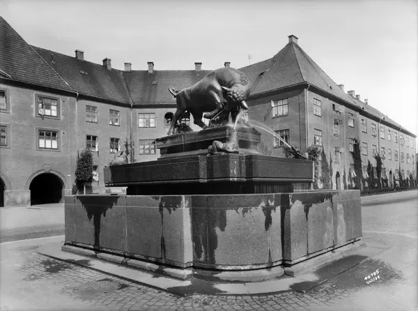 okseskulptur, fontene, bygård, slyngplanter, forhager