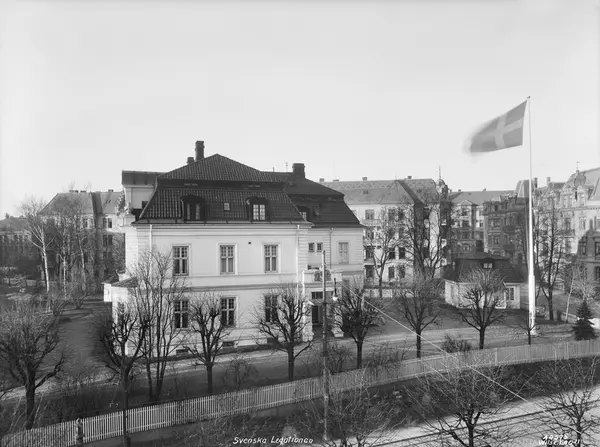 villa, svensk ambassadørbolig, hage, flaggstang, svensk flagg, gjerde, bygårder
