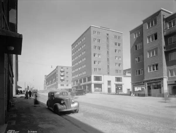 boligblokker, gate, kino, restaurant, meieriutsalg, gullsmedforretning, biler, mennesker