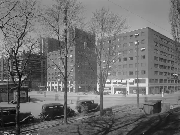 kontorbygninger, Vinmonopolet, Rådhuset, byggevirksomhet, kiosk, biler, mennesker, gateliv