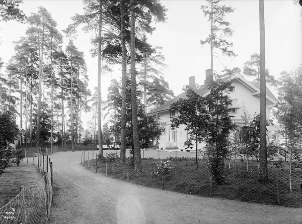 Villa Godthaab, gårdsplass, hage, benk, mennesker, furutrær