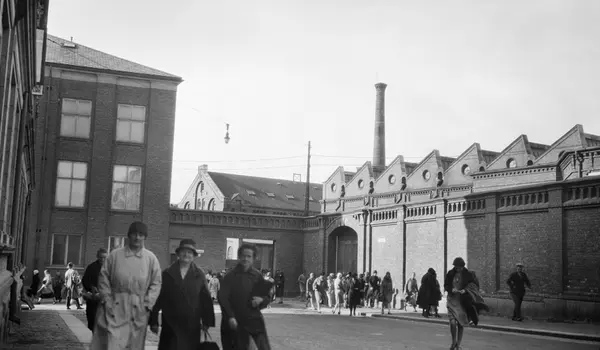 fabrikkbygning, Christiania Seildugsfabrik, mennesker, arbeidere lørdag ved arbeidstidens slutt
