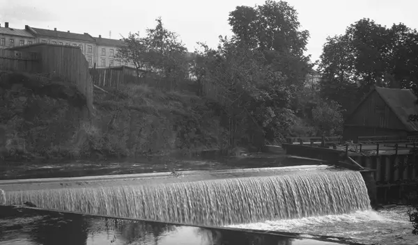 elv, foss, løvskog, bygårder