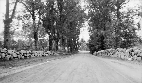 Sørkedalsveien sydover fra Peder Ankers plass. (Voksenkrysset). Voksen gård skimtes bak trærne på venstre side.