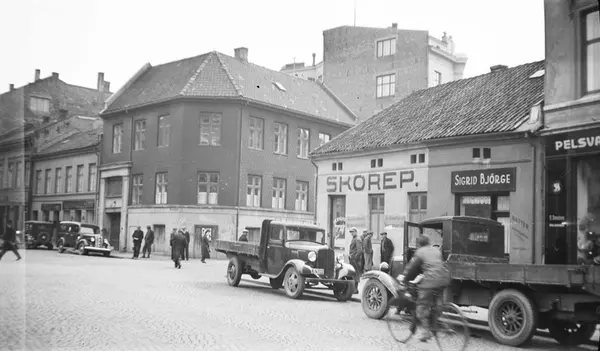 Bilene er fra høyre: Ukjent lastebil midten/slutten av 20-tallet, Chevrolet lastebil 1934 (ifølge Norges Bilbok 1935 tilhørende Kasper Tomter, Bispegata 31), Dodge varebil 1936, ukjent personbil ca. 1930.