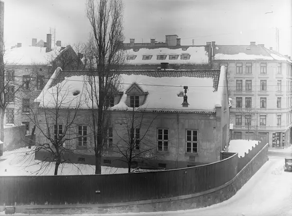 Pleiestiftelse for småbørn, murhus, hage, gjerde, bygårder, snø