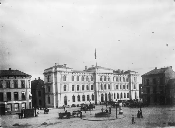 Østbanestasjonen, torg, bygårder, hestekjøretøyer, mennesker, pissoir, fontene, brostein