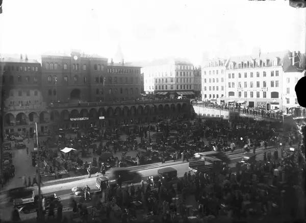 torg, mennesker, torghandel, biler, basarer, politistasjon, Folkets Hus, bygårder