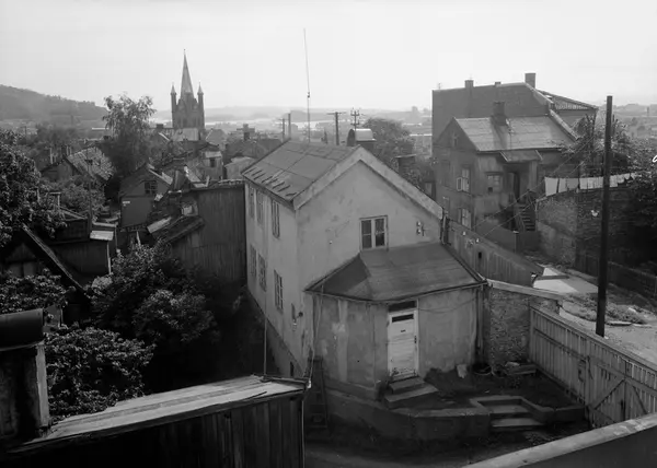 utsikt, trehusbebyggelse, hager, gårdsinteriører, gjerder, Grønland kirke