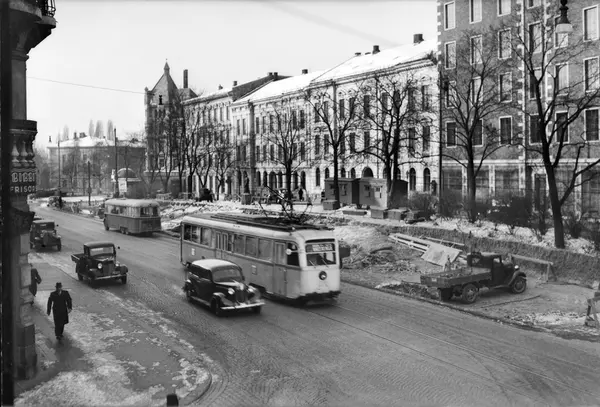 park, gravearbeid, bygårder, trikk, buss, biler, mennesker, gateliv