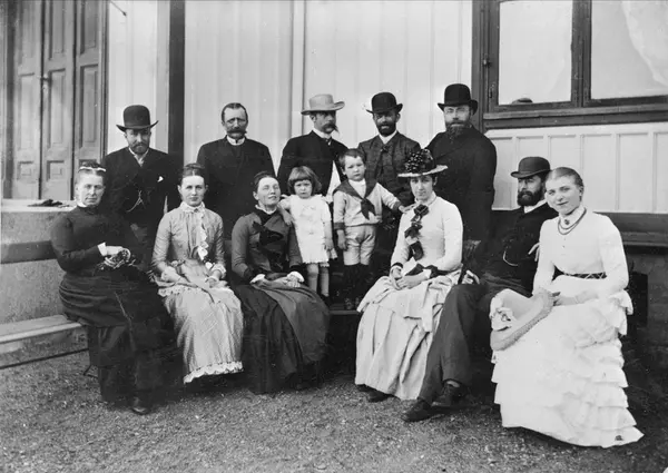 Foran fra venstre: Cevilie Crowe g.m. Halvor Schou, Julie Caroline Helene Løvenskiold g.m. Georg Frederik "Fritz" Kiær, Anastasia Lasson g.m. Hans Henrik Ingstad, Marie Magdalena Schou g.m. hoffsjef Fredrik Frantz Rustad, Hans Henrik Ingstad, Eleonore Cappelen g.m. Diderik Cappelen. Bak fra venstre: Haaken Larpent Mathiesen, Johan Herman Wessel, Frederik Frantz Rustad, Bernhard Dunker, Diderik Cappelen.