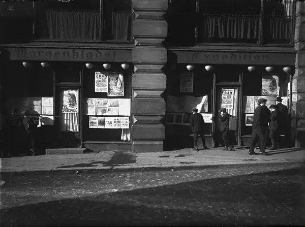 Oppslagene i vinduene forteller om Roald Amundsens forestående Nordpolekspedisjon, som ble endret til ekspedisjonen til Sydpolen.