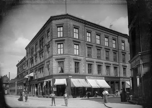 gateløp, forretningsgårder, hjørnegård, skredderforretning, gate, mennesker