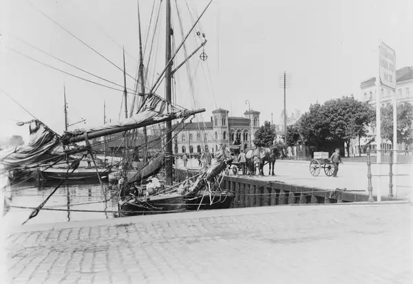 havn, seilfartøyer, hester, vogn, mennesker, håndkjerre, Vestbanestasjonen, bygårder