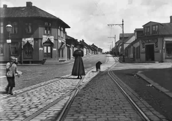 gateløp, trehusbebyggelse, Oscar Møller kolonialforretning, brostein, trikkeskinner, barn, kvinne, hund