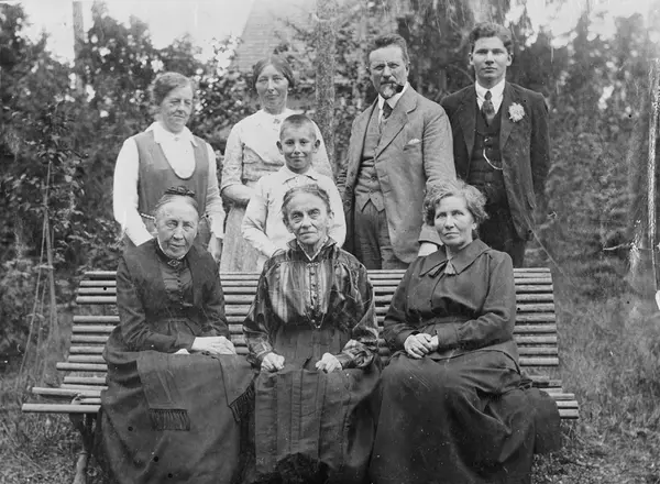 Foran: Thekla Resvolls tante Laura Deichmann, Hilda Stengel Holmsen, Thekla Resvoll. Bak: Ukjent, Hanna Marie Resvoll Holmsen, Per Holmsen, Andreas Holmsen, Dag Resvoll Holmsen.