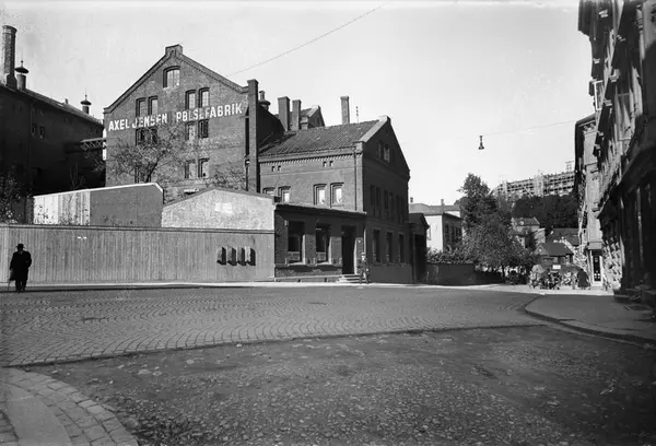 gateløp, Axel Jensen pølsefabrikk, industribygning, bygårder, biler, hestekjøretøyer, boligblokk, byggevirksomhet