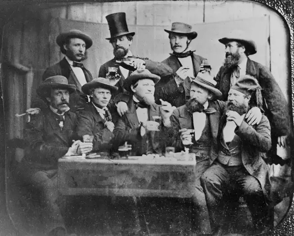Bak fra venstre: Amaldus Nielsen, Adolph Tidemand, ukjent, Johan Fredrik Eckersberg. Foran fra venstre: ukjent, August Cappelen, ukjent, Hans Gude, Olaf Isaachsen.