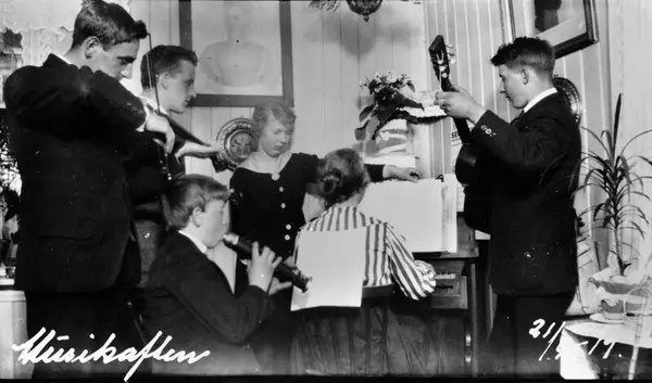 Dyna fyr, interiør, gruppe, kvinner, menn, gutt, musikkinstrumenter