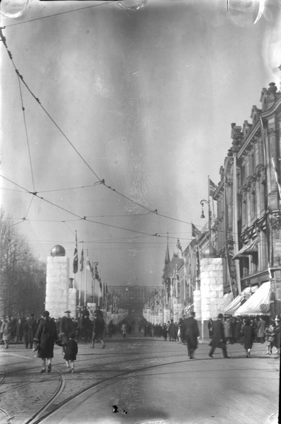 gate pyntet til kronprinsbryllup, issøyler, flagg, mennesker
